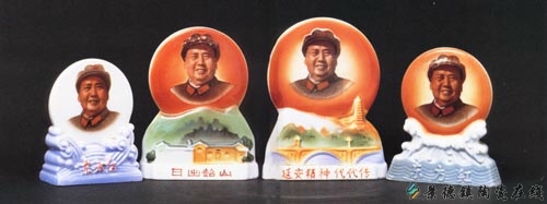 “文革”摆件大都品质较小,一般家庭都可以消费使用。摆件内容以毛泽东各类形象的为多。然后是各类革命圣地,还有就是毛泽东语录、诗词。瓷器摆件是当时家庭里一种时髦的装饰品,也是对领袖敬仰表忠心的需要。 摆件是纯粹的装饰品,在“文革”时期出现,多少也显示其气氛比较“宽松”。樊建川所藏“文革”瓷摆件风景图案不多。这些摆件是领袖像章的另一种类型,否则,脱离政治的纯粹装饰品是不可能生产面世的。形制单一,内容单一,工艺亦无特别讲究之处,基本上都是圆盘固着于底座,底坐上烘托领袖像的图案多半是海水波涛、革命圣地、红旗和向日葵等,类似古代帝王座的格局。 摆件背后有的有单位的名称,估计是该单位向瓷器厂订制。比如“成都铁路局”的两件,多半是摆在火车餐车桌上的。其中较为突出的有《横渡长江》和《桔子洲头》、《龙梅与玉荣》、《白毛女山神庙怒斥黄世仁》等。