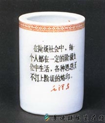 “文革”抄家中破除“四书”大概是砸了许多笔筒。“文革”期间瓷厂生产笔筒想必与大批判写大字报有关,当时人人都挥毫上阵,口诛笔伐,不少人还因此而成就为书法家。当然,瓷厂生产笔筒也有忌讳。“文革”本就是革文化的命,笔筒超出了口诛笔伐的应用,必定惹火烧身。 樊建川收藏的笔筒不多,花色品种也异常单调。这些笔筒大多出自云南永胜瓷厂。永胜乃滇西北偏僻小县,在当时的情况下,其产品能远销四川,应算是很会做生意的。 “文革”期间,知识一钱不值,知识分子被打入黑九类。全社会的风气不是读书,而是崇尚造反精神,不学ABC照样爱中国等等。当时有个小学生,以其反“师道尊严”而闻名全国。另一位“知青”亦因其被“推荐高考”时交了白卷而成为叛逆英雄。一九七七年恢复高考制度以前的中学生即是在这样的氛围中读书,又有免考入大学的“工农兵学员”作他们的榜样,笔筒确实成了一件嫌疑多多的器物,难怪其稀少。“文革”笔筒即使花色、造型单调,却是不可多得的文物,能搜集到已是万幸。