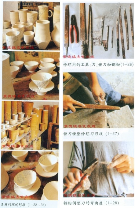 修坯用的工具主要有修坯刀和用来锉磨刀刃用的锉刀,还有用来调整刀的弯曲度的钢钳子。(1-26~28)