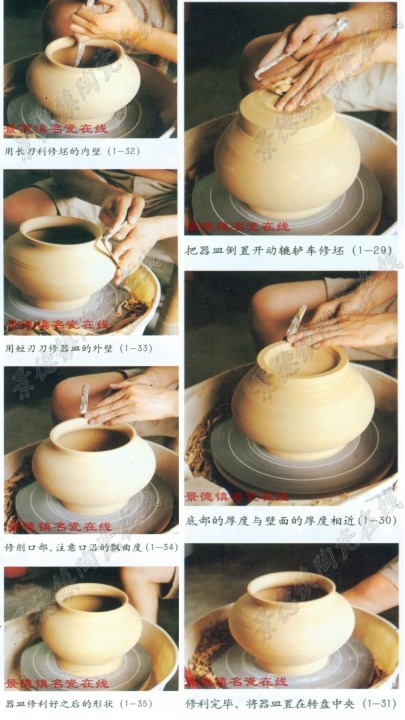 将底部的厚度与壁面的厚度相近,有经验的技工用手指轻轻扣击坯的表面,听声音就能知道它的厚薄;底部修利完毕之后,将器皿正放置在转盘中央,然后转动转盘,用手拍击,使之真正坐落在转盘的中央;再用长刀利修坯的内壁,两手的肘部固定在双膝之上,用力稳住刀锋,以静止不动的刀刃,利削旋转的坯内壁;外壁的修削与内壁基本相仿,但用的是短刃刀,双肘仍定在双腿之上,对外壁进行修削;对口部的修削;要注意口沿的飘曲角度;这样器皿就利好了。(1-29-35)