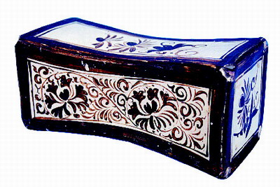 箱形瓷枕,由枕面、枕庙,及枕墙粘合成形的中定体,以长方式为主,贯穿各个时代,唐至五代,流行圆角长方形,到了北宋、金代,出现枕面大于枕体的屋檐状花形、圆梳形、腰圆形、隋圆形、扇面形、扁瓢形,多角形、如意头形等各式瓷枕。翘边式瓷枕为五代样式,枕面凹下,两端翘起。