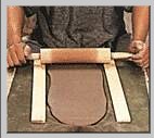 先在陶土下垫一块布,用手掌将粘土丘扁。然后在粘土的两端各放置一和所需泥板厚度等厚的木条,用摊面棍前后滚压,直至压到和木条厚度相同为止。适于制作较大面积的泥板。 | |