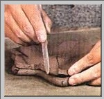 | 7.从中向外按压叶片到靠近垫有泥条的边缘,使之接触到案板。 | 8.揭下叶片。 | |
