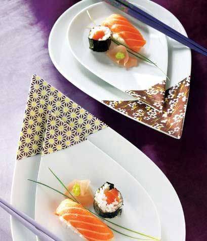 水滴形餐盘可以为餐桌带来新奇的视觉感受,而在尖部用一些柔和的碎花图案装点之后,再摆上颜色清雅而秀气的筷子,让人联想到水面上游弋的扁舟。餐桌上布置出的景象,能与水色相接,是非常难得的巧思。设计这样的餐盘,用碎花餐纸牢牢的粘贴在盘子的尖端就能实现。