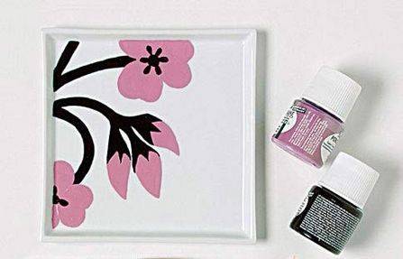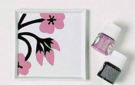 Step2 将厚纸板压在最大的盘子上,在最大的盘子上绘制上完整的图案,并在其余两个盘子上绘出相应的部分图案。需要的话,可以先用2B铅笔按照花枝的图案在盘子上轻轻地勾绘出轮廓,然后用棕褐色的颜料绘制花朵的枝,用玫红色颜料绘制花朵和花苞。画好后放置待颜料风干,再用棕褐色颜料点上花蕊。静置24小时后,放入烤箱用180摄氏度的温度烘烤20分钟,以便装饰画变得可以清洗而且耐擦洗。