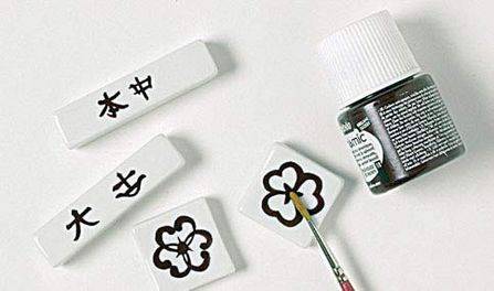 绘上图案和文字时,可以按照图片中的图案进行制作,也可以选择其他的民族图案,将它们绘制在筷子架上。颜料最好不要稀释,因为在陶瓷上绘画需要足够的浓度。画完之后放置一会儿,待颜料干透后,放入烤箱用180摄氏度的温度烘烤20分钟。