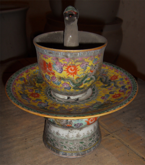 在白腻的瓷面上,有青花鈷料工笔描绘的八条姿态各异的五爪龙,连同杯中的一条雕刻的龙,共有九条五爪龙,寓示皇帝野九五之尊冶的威严。更神秘的是,杯中央的瓷龙颈部有一黑色的圆点,当酒水低于圆点时,一切正常,当水面超过黑点时,杯中酒水很快就流出杯外。这是因为瓷龙一侧与杯底衔接处有一约3毫米见方的小孔,在杯外底中心也有一直径约3毫米的小孔,当往杯中注水超过黑点时,水便从杯内底小孔进去,又顺着外底的小孔流了出去,这其实就是虹吸现象的作用。究其原因是,液体从较高处通过一条拱起弯管,先向上再向下流到较低之处,其因为弯管要呈倒哉字形且一端较长,使用时管内必须先充满液体。公道杯里外的两孔之间曲弯管相连,外部一端较内端长熏而瓷龙所标黑色圆点的位置即弯管最上端的部分。当杯中水低于或平齐于黑点时,水不能漫过弯管而泄流熏当水超过黑点时,水面高出弯管产生压力,于是通过虹吸而使水顺右弯管流到杯外直至流净。是一件集工艺性尧知识性尧趣味性和审美性于一器,欣赏