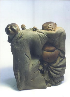 创作自述 现代陶艺的美学贡献之一,便在于它深入发掘并高度显示了"火"的美学创造潜能,使之成为注入陶艺以生命力的伟美国著名陶艺家对火的意义有地深刻的评价,他说:"在陶艺创作中,火是一个统一性的环节,其它所有环节都最终在此由火连接起来,表现出最终的效果"。"火"的创造性作用是单凭借人力无法替代的特殊力量,它在烧造领域迅速转化成人类的"第二创造力"。这种力量使人与物处于"间离"的关系中,可以深入内部去改变物的原始性质。对于艺术家来说,这种力量是充满诱惑力和神秘色彩的。因为在一个复杂而漫长的心理应战过程中,艺术家期盼的是一个新的艺术生命体。然而烧造?quot;间离"因素,同时也构成对艺术家的一种约束,一道无法逾越的"火墙"。它使得艺术家不能不认真对待"火的洗礼",不能而且无法回避烧成的工艺技术问题;温度与升温典线、收缩与收缩系数、膨胀与膨胀系数、融熔与融熔点以及入窑与入窑形式等等。如果一个艺术家不认真去研究烧造之火,很难说同样具有野性与任性一面的烈火不会对其作品撒野施威了。 烧造的过程在一定意义上存在着"偶然"因素,但在很大程度上它又不属于绝对意义上的偶然。这种"偶然"是一种寓寄着必然的偶然。一个成熟的陶艺家,往往能?quot;限制"中预见或洞察到产生"偶然"的潜在契机,以致他时常能觅获到富有创意的创造性偶然。我的先生周国桢教授有过这样一个经历。在那个电力缺乏的年代,他时常为作品的烧制犯愁,烧制过程中电窑突然的断电每每给他带来创作上的巨大损失。因为这一来就无法达到技术上所需的烧成温度。(他早期十分注重釉色的完美,即合传统技术规范的完善釉色。)一次他正在烧制一件高温釉的"花豹",当温度升到900℃时断电了,他沮丧地关闸回家,准备第二天继续。次日仍未来电,他只好打开窑门,可万万没有想到这一事故竟创生了一件精美绝伦的作品。(日后多家博物馆争着高价收藏。)釉色在900℃的温度下呈现分裂、聚缩状态,形成自然而有序的龟裂,恰如其分地表现出豹子的状貌特征。他把这件动物雕塑取名为"雪豹"。随后,在很长一个时期,他不断发展完善这一独特技巧,在运用上达到随心所俗的程度,从而形成了他后期陶艺创作的典型风格。 至于我个人对"火"的运用和表现,我认为还是缺乏创造性的。因为在很长一段时间,我没有条件拥有自己能操控的窑炉。尽管如此,我仍然在受制的烧成温度和升温曲线下,通过对坯的处理和局部的化学氧化物和渗透,以达到并留住"火""走过"的流迹。我觉得自己处理和对待"火"的态度是严谨的。在中央美院的这些年,我有条件并认真地?quot;火"的表现力做较深入的研究和试验,从而积取了许多有益的经验。我想这些心得观众可以从我的新作中体会到。我想说,"火"虽是神秘而深不可测,但并非不可认知和掌握,只要肯下功夫。 二、关于雕塑与陶艺 实际上,现代雕塑创作的技法和手段相当丰富,已远不只是传统意义上的架上处理一种方法。因此在这里要把陶艺与雕塑作比较,也只能就一般的雕塑特性而言。从某种意义上来说,陶艺与雕塑的区别是明显的,甚至是本质的。这方面的问题我在《陶艺特质论》一文中,已有较深入的论述。这里只能很粗略地说说。首先在材质的选择上,虽然两者使用的都是粘土,但对陶艺来说,这个粘土是既是终极性的(这种终极性最终落实在一件作品之上),又是经过烧结的,我称之?quot;变质的泥性"。"手语"留在泥坯上的痕迹,经陶化或瓷化后已不属泥的性质却依然呈现泥的性态,是一种"真实的假象"。这种由粘土内部质的变化而形成的虚幻性,与一般雕塑只是复制到转移粘土形态的物理变化是截然不同的。其二,就创作过程和工艺相比,陶艺肯定是独特的。就作品的产生而言,雕塑创作莫不包含构思与制作两个基本程序。雕塑家作为创作主体始终直接参与全过程,以致这种过程是充满必然性而足以完满呈现创作意图的过程。显然陶艺创作?quot;初成型"阶段,实际上已基本完成一般雕塑创作过程的全部。而之后的烧造及后处理一系列环节,陶艺却还须完成,因此陶艺创作过程,比一般雕塑创作过程"长度"更大。陶艺创作"长"出的这一部分,使构思与制作呈现一事实上的"间离",我称之为"创作过程的间离性"。陶艺成型的特殊之处还在于烧成工艺环节要求形体(坯体)呈现中空状。这种中空的要求,使得陶艺无法象雕塑那样进行"实在"的塑造,而只能通过技巧性极强的泥条盘筑和泥片成型等工艺手段加以实现。其三,釉色的表现,呈现出雕塑所无法企及的表面效果,从而构成陶艺特殊魅力的一个重要组成部分。最后,陶艺家和他的作品将面临火的挑战--即我所谓的"烧造的创造性",以致要在一个复杂而漫长的应战过程中,去实践决断偶然因素的"创作意图"。这实在是一种既紧张而又妙趣无穷的审美心理体验。介入火的创造性的陶艺创造,很大程度上会得益于种种"偶然",也就是说种种"偶然"可能向你呈现出一个也许是陌生而颖异的面貌,让你领略一次次出乎意料的刺激与诱惑。显然,陶艺的特性和独特审美价值,就显示在偶然与必然、顺应与同化的辩证关系中。 肌理语言的发掘是美术创作的各种艺术形式所注重和研究的课题。就陶艺而言,肌理的探索直接影响到陶艺语言的推进和陶艺特征性的发扬。关于陶艺肌理的研究,以及提