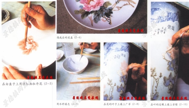 六拖:是在未打玻璃白的块面上以光明红(西赤)等鲜艳颜色进行,光明红属新彩颜色,可直接画于瓷面,无须罩色,移植到粉彩上来是丰富色彩。画面上的大红袍、大红花、大红柱、大红桌等都是用光明红拖染出来,使物件明亮光滑,粉润并有阴阳光和立体感,层次感。方法是用两支笔进行,一支色笔蘸好光明红紧靠线条上色,立即用扁拖笔向亮部拖染开,使色调阴阳光过渡或平滑,不露痕迹·调色时和扇笔上可适当蘸些乳香油以帮助粉润,一个块面一个块面进行,一朵花,一件衣服要统一和谐。粉彩瓷件填色完毕后,在烤花前还有几件工作要做:1、检查漏单,看看有无遗漏上色的细小局部,如有漏单要及时补上。2、消除色脏,因为整件瓷胎在经过画,填两道工序,难免在空白瓷胎上会有零星色脏,一旦烧好就成毛病。3、写字、写底款,根据画面内容题上几句诗词、可长可短,如果是创作作品还要题上作者的名字并加小印。底款一般是“景德镇制”或仿古底款印章,一件粉彩瓷到此才算完成,可以进炉烤花。画填技法介绍结束,希望粉彩艺术能继承传统,发扬光大。