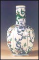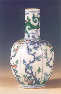 | 成化斗彩瓷除个别大件和少数大碗 外,多为小件器物,造型别致小巧、景 致秀美。主要有盖罐、碗、杯、高足杯洗、碟、盘、盖盒、瓶等。其中最负盛名的是高足杯、鸡缸杯、葡萄杯、天字 罐等。 成化斗彩器的纹样丰富多彩,有人 物、婴戏、鸳鸯莲池、花鸟、缠枝莲、瓜 果、葡萄、五供养、团花、灵芝、山石 花草、团龙、夔龙、海水龙纹、海水飞 |