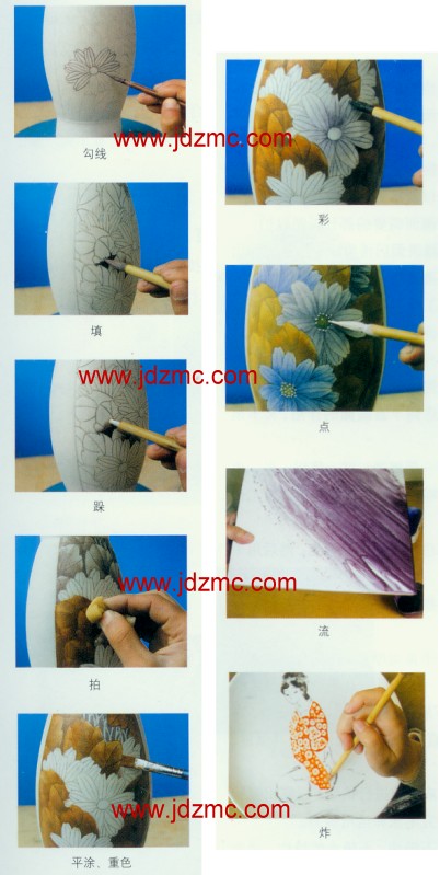 填 将水料或油料填涂于画面需要的部分以便跺拍。 跺拍 跺是将颜色涂于瓷器表面后再用跺笔跺平或跺出明暗,使颜色更趋平整化,转换柔和,均匀地过渡;拍和跺的技法基本相同,只是使用的工具不同。跺拍用丝绵球或者海绵将色拍平。跺一般用在小面积上,拍则用在大面积上。