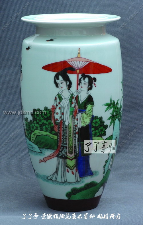一件好的艺术瓷作品,要有三个标准,一是器型要漂亮,适合画境的表现需要,如画单个仕女侍立修竹下,瓶型就应该是以瘦长的梅瓶或橄榄瓶为宜;二是釉色白腻,以青白釉最好;三是装饰上要有自己的思维,包括造型形式、构图章法、色彩语言等等,都要有个性。三者统一,就有民族的文化、地域的特色、个人的风格。