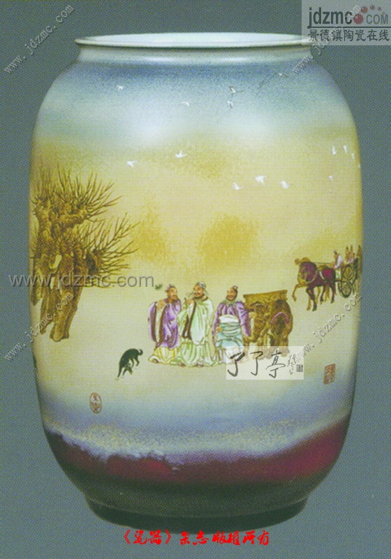 现代粉彩瓷绘要创造别开生面的新意境,就必须探索新的艺术表现形式。“笔墨当随时代”,现代粉彩瓷绘艺术家一面继承粉彩色彩丰富、粉润柔和、画工细致、娴熟流畅的传统技艺精华,一面又着意强化作者艺术创作的主体意识、情感意境的表现,不断创新,使现代审美情趣与传统艺术相结合,力图突破传统粉彩瓷绘艺术纯用笔作画的单一表现形式,结合西法绘画对自然物象结构的表现,注重表现绘画内容的块面、层次和空间关系等,树立新的造型观念,打破自然物象结构的约束,重新排列组合,强化意象造型,表现再造的自然和艺术家的心灵,在笔墨表现上再强调、再发挥,使之成为更为独立的艺术表现要素。如中国工艺美术大师李进的粉彩瓷板画《夜朦胧月朦胧》,作品表现采用西方绘画的构成方式,着意创造画面的空间意象,突破了传统粉彩瓷绘勾勒填色及对自然空间的摹拟表现的固有传统粉彩表现形式。画面人物形象秀美,气质高雅,神态若有所思,若有所待,传达出内心的含蓄与朦胧,给欣赏者以自由的想象空间,颇有创意。现代粉彩瓷绘作品一面继承勾勒细致、设色丰富的传统技艺,一面又着意探索在色彩上吸收西方绘画光色变化统一的效果,采用多种技术手段制作出各种色彩微妙变化的效果。中国工艺美术大师李进的《达摩渡江》粉彩瓷板画,以单纯淡雅的蓝色为基本色调,突破了传统粉彩瓷画工艺表现色彩繁琐、形式浅直和程式化,从而更加突出地表现了粉彩瓷绘作品的精神内涵和意蕴之美。作品格调高雅,笔法简练,人物形象形神兼备,颇为世人称道。(作者为中国工艺美术大师,江西陶瓷工艺美院副院长、教授)