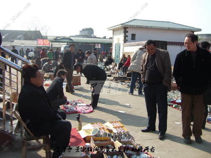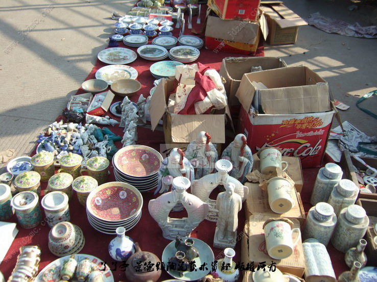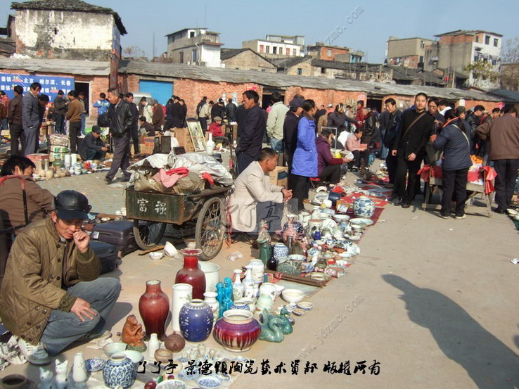这一市场的形成还只是近几年的事,摊贩多来自于景德镇周边地区来景务工的农民以及部分下岗工人等。他们的货源,主要从附近乡村收购,而赝品则来源于市区樊家井、筲箕坞等几个规模很大的仿古瓷生产基地,古瓷残片则在散布于全市城乡的建筑工地及未受保护的民窑遗址等处挖取或拾取。