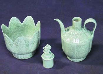 北宋景德镇窑制品。此系注子(壶)与温碗组合配套的酒器,通高25.8厘米,碗口径17厘米。壶圆腹作六瓣瓜棱形,细长流(壶嘴)、狮纽盖、圆足。温碗犹如一朵盛开的莲花,将壶置于碗内,以热水温酒,是一件造型优雅,便于实用的青白釉工艺品,为北宋流行器式。此器1963年出土于安徽省宿松县宋元佑二年(公元1087年)吴正臣大人墓。现藏安徽省博物馆,为国家一级文物。了了亭独家配图专版 |