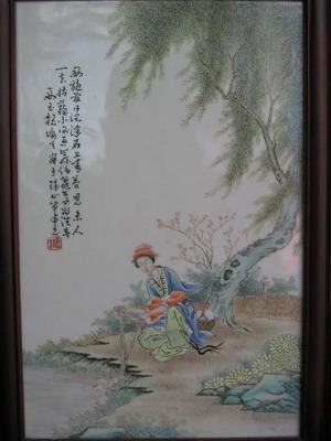 了了亭:魏墉生:又名魏荣生,生辰不详,师从王琦擅长粉彩人物画。在前景德镇陶瓷学院教书。以绘制古装人物画为主,从画工和形体上辨别,该画面为基本功很差的人士绘制,难为魏墉生水平。