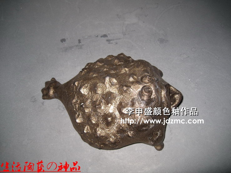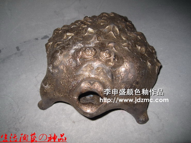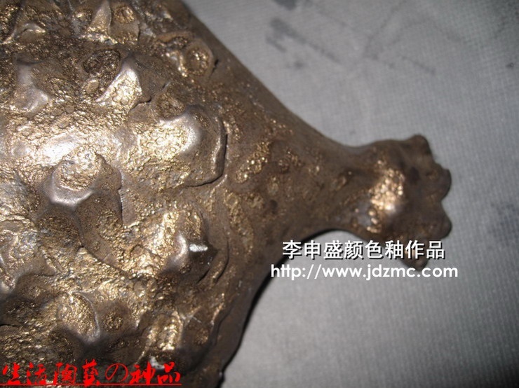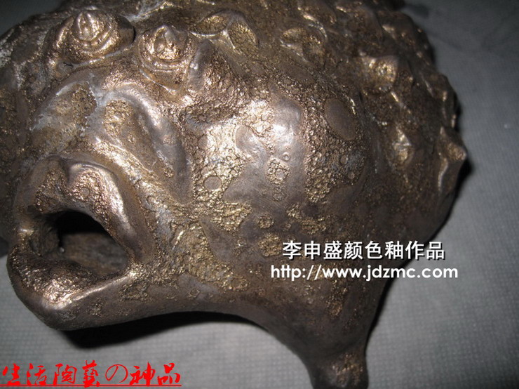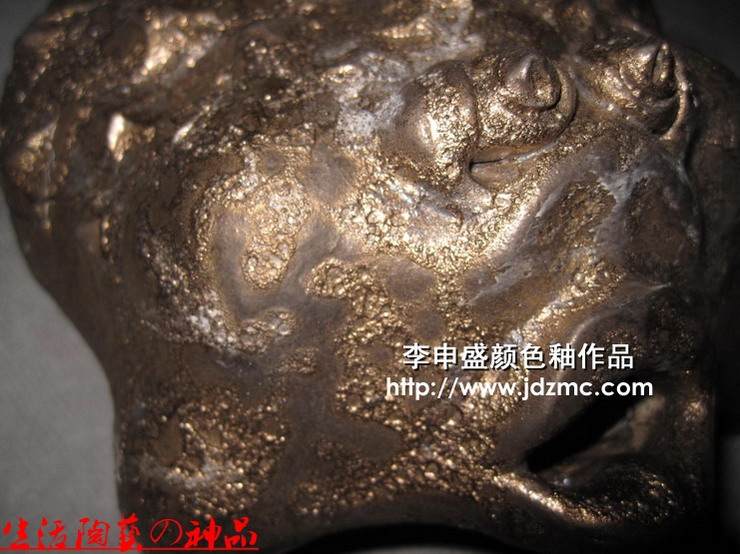 这是笔者的作品--金铜釉。研究耗时一年之久,釉体为高温单色釉,表面有微凸饰纹,其釉面为金属铜化合物,釉质厚,易流淌、不均匀,半途凝结,这些有着向宋瓷靠拢的特征。观釉色,似金似铜,微凸纹饰窑窑不一,色彩均有不同。如为钵形,纹理凝结成字形,如神符一般。击之,闻声有金属之音,音色如磬,古韵悠长,有类似铜磬之美。如为雕塑,高贵凝重,釉中肌理变化神妙莫变。今天展示的只是金蟾一只而已,还有那神妙的钵体因为保密原因暂不公布。此金蟾坯体为全手工制作,独一无二。今天展示为首件,下午刚刚从窑里拿出,已被一位艺术家强打扼要的要走了。其成品身上您可以观看到这种釉体各种神秘之处,如身上的自然釉体形成的的仿生疙瘩,将景德镇高温色釉仿生能力给予了极高的诠释。正面蟾蜍嘴巴两边的纹理形成了两“字”,其玄妙之处直接可见,通体金色,高温凝结,恒古不变。(了了亭·李申盛/文)