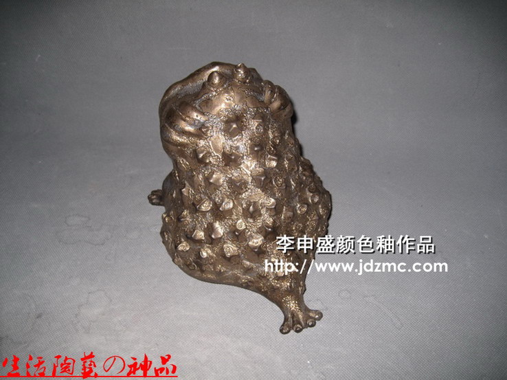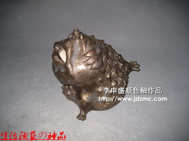 这是第二件三足金蟾作品,依然使用的是金铜釉。是鱼林和我共同设计,金蟾坯体为全手工制作由他制作,我协助改进,釉体的烧制就是我自己的那份了。每一个金蟾独一无二。只是形态上过于个性表现了,对神态的动作捕捉还有一定理解距离。倒是这一件是我放在店里面镇镇的,喜气,又大,换成了立状,感觉还是很不同的。明年过完年以后,和鱼林在好好搞搞。这件成品身上您可以观看到这种釉体各种神秘之处,如身上的自然釉体形成的的仿生疙瘩,将景德镇高温色釉仿生能力给予了极高的诠释。玄妙之处直接可见,通体金色,高温凝结,恒古不变。(了了亭·李申盛/文) 解释: