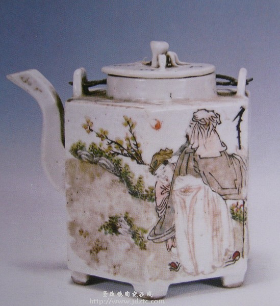 | 达和《出游图》浅降彩方提梁壶 | |||||