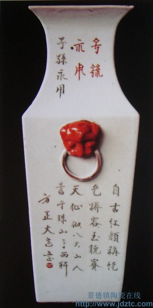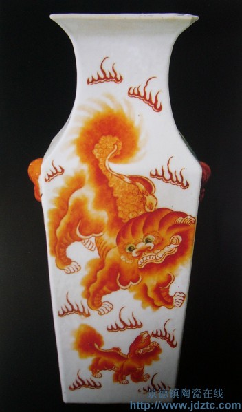 太少红狮 兽耳衔环方口瓶 光绪1902年 易阳 |