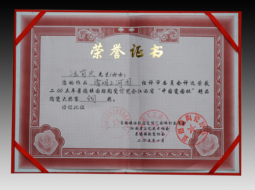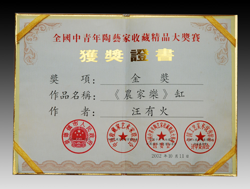 作品《仓龙教子》瓷板评为浮雕艺术精品,并被新加坡收藏家收藏; 作品《仓龙如海、国富民强》瓷板桌被台胞收藏; 作品500件瓷缸《保护生态平衡》在2001年江西省首届民间工艺美术精品荣获二等奖; 作品500件瓷缸《农家乐》在2002年全国中青年陶艺家收藏精品大奖赛荣获金奖; 作品500件瓷缸《和睦相处》荣获优秀作品奖; 作品500件瓷缸《陶冶图》在2003年被中国博物馆收藏; 在2005年国际陶瓷博览会“中国瓷园杯”800件瓷缸《清明上河图》荣获铜奖 作品200件《陶艺碗》在2006年国际博览会精品陶瓷大奖赛荣获优秀作品奖; 作品《十二生肖壶》被美术馆珍藏; 2006年,汪有火先生被评为中国收藏家最喜爱的陶瓷艺术精英; 景德镇“一套”“有线三套”“景德镇日报”“景德镇信息报”“瓷都晚报”多次播放,并发表作品分别纳入《世界优秀专家人才典》、《中国书画艺术博览》第三卷、《景德镇陶瓷艺术家辞典》、《江西省陶瓷艺术作品展—珍藏上》、《江西省陶瓷艺术作品展—珍藏下》《景德镇邮政大黄页》……作品深受东南亚、美、法、英、港澳台国家和地区客商的收藏家的喜爱,具有极高的艺术欣赏和收藏价值。