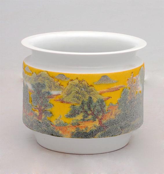 汪雅平,江西景德镇人,高级工艺美术师,毕业于景德镇陶瓷学院。他自幼酷爱美术,擅长釉中彩,画面表现内容丰富多变,构图注重气势与意境,作品多次参加全国各地的美展并获奖,深受美术界人士与收藏家的好评。 景德镇陶瓷举世闻名,陶瓷装饰百花齐放,不断创新,“釉中彩”一枝独秀。 釉中彩一九六二年由江西景德镇轻工业部陶瓷研究所研制成功。代表了20实际制瓷史上的最高水平,作为国家礼品瓷。通过国家领导赠送给外国首脑,被赞之为“稀世之宝”。 釉中彩陶瓷系一总称,其中包括“领袖用瓷”和景德镇为毛泽东研制的“7501”工程瓷器(也称作中南海用瓷)。釉中彩不仅不含镉,无铅毒,而且重量轻,色泽美,胎体细腻坚实,色彩典雅,造型端庄。具有良好的透光性,正是“明如镜,薄似纸,坚如铁,声如馨”,几乎无暇可寻,这种特制瓷需经历1360度高温三次烧制,每次烧制均需将瓷器置于瓷窑中心部分,依仗均匀的火力才能使釉面白里泛青,柔润如水。 “以领袖用瓷”为代表的“文革瓷器”由于存量稀少,货源奇缺,已经成了艺术品市场可居的奇货,成了市场价格飚升最快,涨幅最大的收藏新贵,五年内涨幅已超出两万倍。