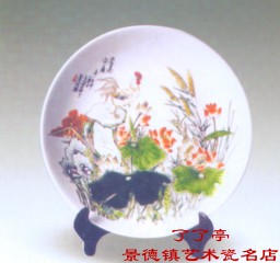 莲花,在景德镇陶瓷美术的青花、古彩、粉彩与新彩装饰中,是经常用到的题材之一。而且其画面和纹样,常常受到,广大收藏者所喜爱,拥有较大的市场。擅长于莲花纹饰的新人,更是层出不穷,一派“后浪推前浪”的大好景象! 一、 莲花的历史由来 莲花,又名荷花,亦称荷莲。莲花的历史较为久远。《诗经》中叫荷华,在《说文》中叫夫渠,在《楚辞》中叫夫容,在《群芳谱》中叫水芙蓉,《本草经》中叫水芝,《古今注》中叫泽芝,《三余贴》中叫玉环,《三余赘笔》中叫净友,《三柳轩杂识》中叫净客,《西溪丛语》中叫溪客,《类腋辑览》中叫它《六月春》等不一而足。 莲花的种类很多,据《花镜》和《群芳谱》记载,就有千叶莲、四面莲、并蒂莲、洒金莲和重台莲等十几种。莲花按用途分可以划为三类: 1,以食藕为主的叫藕莲,象美人红、大乌刺等.藕莲种植于水田中的叫田藕(亦称甜藕),种植于池塘中的叫塘藕(亦称糖藕).藕还能制成藕粉,是绿色高级营养食品。 2,以食莲为主的叫子莲.莲子食用又分莲肉与莲心,莲肉是甜汤中的美味佐料。莲心性味甘苦能明目,可以泡茶喝。如大白莲和九眼莲等。 3,以观赏为主的莲花,如并蒂莲、重台莲和睡莲等,花容十分艳美,且发出沁人肺腑的清香。 此外,莲花还是一种很有价值的中药.莲叶能清暑解热,莲蒂能和胃、安胎,莲梗能通气宽胸,莲瓣治暑热烦渴。莲须《雄蕊》能益肾固精,莲房能消瘀止血,莲子能健脾止泻,藕节能解酒毒,消烦恼。  二,莲花的文化现象 用莲花题材作纹饰,在战国的染器和绢帛的花纹上均可以找到它的踪迹。但是,莲花纹饰得于丰富和发展,还是从魏晋南北朝开始的,这与印度佛教传入中国有很大关系.晋代的鸡头壶中有莲花纹北魏石窟中的壁画,莫高窟中大小佛的石刻底座,均刻有莲花瓣纹,至隋唐、五代,“莲花纹已经传入寻常百姓家,”遍及屋柱的底座石墩上以及木质傢俬上,(如:花床、椅桌、箱柜上.)在年画中可以看到坐莲的如来和观音,剧中可以看到带着莲花帽的唐僧和法海.在皇宫的御花园与豪绅的后花园中均设置池圹种植着莲花.文人学士的衣袖上绣有莲花,在民间新婚的被子绣有并蒂莲.唐代诗人李白,还另有一个名字叫青莲.宋代名将杨廷昭(即杨六郎)被后人喻为莲花神,古人有“六郎似莲”之说。民间传说<东游记>.八仙飘海中何仙姑,是一位手执莲花的仙女.《群仙上寿》的和合二仙,和仙是一位手执莲花的仙童。明人写的古典小说《封神演义》中托塔天王的三太子哪吒是依托“莲花身”立命的天神。明代画家陈洪绶又名老莲,清代画家吴友如、马骀的百美图中有个美人步步生莲。 自六朝《即南北朝》以来,莲花深入人们生活的各个领域,形成一种文化现象,出现了许`多描写采莲的好诗好词。 六朝乐府清商曲中有一首好词:清荷盖绿水,芙蓉披红鲜,下有连根藕,上生并蒂莲.”在唐代日理万机的皇帝,唐太宗李世民曾乘彩舫下莲塘,写出了“船移分细浪,风散动浮香.游莺无定曲,惊鸾有乱行.莲稀船声断,水广棹歌长的”《采芙蓉》诗。王昌龄的“荷色罗裙一色裁,芙蓉向脸两边开.乱入池中看不见,闻歌始觉悟有人来”的《采莲曲》和白居易的“菱叶索波荷贴风,荷花深处小船通.逢郎欲语低头笑,碧玉搔头落水中”的《采莲曲》,是写江南采莲的千古绝唱,宋代范大成的《泛舟》”“行入闹荷无水面,红莲沉醉白莲酣”和杨万里的《晓出》“接天莲叶无穷碧,映日荷花别样红”。同是千古佳句。北宋周敦颐写过一篇《爱莲说》,借物咏志的抒情散文,写得情趣高雅,寓意深刻,耐人寻味。说“予独爱莲之出淤泥而不染,濯清涟而不妖,中通外直,不蔓不枝,香远益清,亭亭净植,可远观而不可亵焉”。文中还称菊花为隐士,牡丹为富贵者,莲花为君子,这三种形象的比拟,直到如今,还继续为人们所称道。莲花深入人们生活的各个领域。甚至充当人物中不同性别,不同年龄的角色,与人结下了不解之缘,而形成一种文化现象。 三、莲花的民间彩头 莲花与“连”、“廉”同音。所以,莲花可以寓意“连年”、“廉洁”象征着持续、久远、纯洁、清白。莲花又叫荷花,荷与“和”、“合”谐韵,因而,荷花可以寓意“和睦”、“合作”,象征着和合如意,同心同德,团结一致。因此,把莲花归为三类。 (一),以“连”字为彩头的题材 连年有余 连升三级 连年太平 连中三元 连年如意 连科登第 连年红利 百子连科 连生贵子 美誉连城 连生七子 仕途连年 连生九孙 好运连来