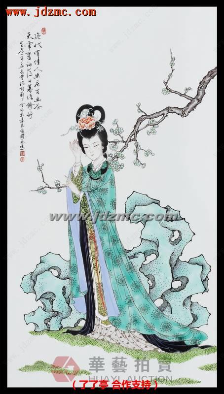 成。一位衣着华丽的古彩仕女站在太湖石前,