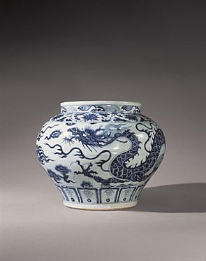 景德镇元青花装饰艺术,不仅继承了汉唐现实主义优良传统,而且具有自己鲜明的时代特征。它既不同于唐代艺术那种雍容富厚之态,又别于宋代艺术精巧秀丽之姿。元青花装饰艺术异军突起,气势磅礴,笔势飞动,讲求大效果。不拘泥于细微末节,即使云纹、海水、四方、二方连续等,那种需要规矩的图案纹样,也只是大体规整而已。其用笔纯熟,悬肘运腕而写,挥洒自如,转折有效,呈现出一种浑厚而又妖娆雅致的神韵。 |
