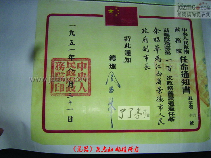 在余祖继那间办公室里,他打开了自己珍藏多年的老照片和余昭华生前的一些证件及文献资料。有周总理签发的任命书、景德镇副市长工作证等。最吸引人的,是余祖继保存近三十年的余昭华追悼会的照片。 余昭华是1969年12月20日病逝的,去世之前曾担任过景德镇副市长,并任市工商联一至六届主委,市民建一至五届主委及全国工商联一至三届执委。按说,在余昭华病逝后就应该举行追悼会的,然而其追悼会却在他去世10余年后才举行,可以说这是一次迟来的追悼会。 在各界的评论中,对余昭华之于景德镇陶瓷事业的发展所作的贡献给予了高度的评价。 1949年4月下旬,中国人民解放军第二野战军第五兵团17军49师侦察连和146团前卫营冒雨进入景德镇,自此景德镇获得解放。余昭华得知这一消息后,即在黄金埠处理准备运往绍兴的瓷器之后,马上赶回景德镇。此前,他曾接触过以工商业为掩护的中共地下党员,对共产党的有关政策听到过一些宣传,有个基本了解。他一到家,见家里驻扎了近百名解放军,对他及家人态度和气,部队领导又与他谈到共产党的民族工商业政策,他心中更加有底,庆幸景德镇人民和工商业者获得了解放。不几天,他参加人民政府组织的工商政策宣讲会,又明白了党对工商业者实行赎买政策,感到共产党的政策好,在军管会向工商界开展支前借款活动时,他亲自开仓,请驻扎在家里的解放军,人人装满米袋,不计数目,并说不用归还。 当年5月,他第一个响应中国共产党关于积极恢复瓷业生产的号召,拥护人民政府保护工商业者的政策和实行“两资两利”的政策。他率先恢复生产,并利用自己在窑帮的影响,说服与动员同行开工。还将自己的窑场空出窑位,帮助一些小手工业主烧瓷器。在他的带动下,复工的窑户达646户,景德镇的窑火又红了起来。 由于余昭华在恢复和发展生产中的积极表现,11月,被推选为景德镇市陶瓷生产联合会筹备委员会主任委员。第二年3月,在市首届各界人民代表会议协商委员会第二次会议上,被选定为景德镇市工商界代表,出席江西省首届一次人民代表会议。 1950年,国家发行胜利折实公债,动员工商界涌跃购买。余昭华当场认购300份。在抗美援朝运动中,余昭华带头捐款四千万元(旧币),还会同工商联其他人员,登门上户,发动窑户和商户捐款,共捐款一十五亿三千六百四十七万元(旧币),捐献“景市工商号”和“景市瓷联号”飞机两架,受到江西省政府主席邵式平的嘉奖。在1951年1月召开的景德镇二届一次各界人民代表大会上,他以近乎全票的172票(173名代表),当选为副市长。 “文革”开始后,余昭华受到冲击,在1969年病逝。直到十一届三中全会以后,党和政府为余昭华举行了隆重的追悼会。余祖继说,当时追悼会的规格很高,在家的市领导都去了。 这是社会和景德镇历史对余昭华的肯定。