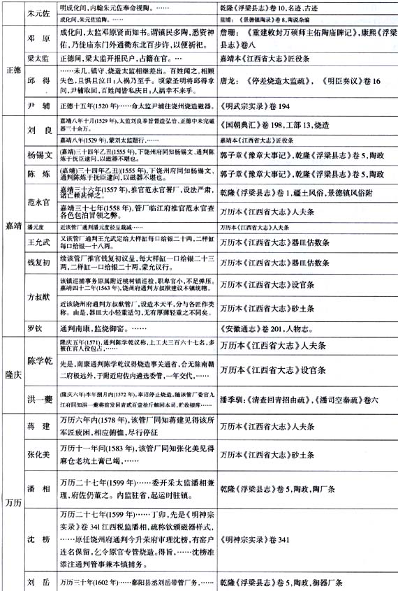 弘治时期的“中兴”气象在孝宗死后立即消失,随之而来的是明武宗的腐朽统治。武宗正德帝昏庸腐朽,在位十六年,全由宦官擅权,景德镇御器厂的烧造也由宦官把持。《陶说》卷三正德窑记:“正德初置御器厂,专管御器者复用中官也”。“正德十一年五月(1516年)遣中官监督烧造磁器”{25}。正德十四年(1519年)巡按江西御史唐龙上疏谓:“……未几,镇守、烧造太监相继差出。百姓闻之,相顾失色,且惧且泣日:人祸乃至乎。顷蒙圣明将邱得拿问,尹辅取回,百姓闻皆私庆日:人祸幸不来乎。自兹良善乐业矣,官府不添料派矣,狱讼贼盗日可消矣。……伏望查照天顿年间停差事例,将江西镇守太监崔和取回别用。一应地方事宜,俱责成巡抚三司等官综理。将烧造太监永久查革。磁器行令饶州府督造,起解供用{26},结果却是“疏入,帝不纳”。反而于次年十二月,再次“命太监尹辅往饶州烧造磁器”{27}。 正德十六年三月(1521年),明武宗死后,世宗即位,是为嘉靖。嘉靖初年赴景德镇督陶的是太监刘良。“嘉靖八年十月,太监刘良奉旨督造弘治、正德中未完磁器三十余万”{28}。 嘉靖九年(1530年)以后,景德镇御器厂的监陶体制发生了重大的变化。“陶监有官。先是中官一员专督。嘉靖九年裁革,以饶州府佐贰官一员管督”{29}。从这一年开始,督陶官改由地方官兼任,这种地方官督陶的体制在隆庆朝也延续下来,一直持续到万历二十七年(1599年)。这从本文后附的《明代历朝御器厂督陶官一览表》中就可以清楚看出。 “(万历)二十七年,矿税役兴,厂委开采太监潘相兼理,府佐仍董之。内监驻省,起运时驻镇”{30}。此时,景德镇御器厂的督造大权又回到了宦官手中,而地方官只是辅佐宦官,具体负责窑务生产。这种局面一直延续到万历末年,神宗死时,遗诏罢一切矿税并新增织造等项目{31},皇太子遵从此诏书,令尽行停止,税监潘相之流亦撤还北京。至此,明代的宦官监陶体制才告结束,以后,“终明之世,中涓弗遣”{32} 综上所述,洪武朝,景德镇御器厂的督陶官都由朝官或地方官担任。永乐、宣德时期,宦官势力渐长,开始出任监陶官,但此时宦官监陶的体制还没有固定下来,朝官也可担任督陶官。从正统朝开始一直到嘉靖九年,宦官势力极度膨胀,以至于景德镇御器厂的窑务几乎全部由宦官所把持。由于宦官监陶弊害横生,引起极大的民愤,招致朝廷一些正直的大臣极力反对,于是从嘉靖九年(1530年)开始、历隆庆一朝至万历二十七年(1599年),才改以饶州府的地方官担任。万历二十七年以后,因矿税役兴,太监潘相再次掌握了御器厂的督造大权,一直到神宗死后才告结束。而此后明代景德镇御器厂的生产也大为衰落,几乎陷于停顿。 二.内府对景德镇御器厂陶政的干预 除了直接派宦官赴景德镇御器厂监陶以外,内府还通过其它手段对御器厂的生产进行干预和控制。 官窑与民窑的一项重要区别,就是官窑本身没有生产的自主权,不能决定生产产品的种类、样式和数量,这些均由官府决定。官府根据需要,对陶瓷产品的数量、造型、纹饰甚至题款等都作了详细的规定,官窑只能根据规定进行生产,不能有些许的改变。 明代景德镇御器厂的生产也是由官府下达生产品种、款式、规格、纹饰和数量。御窑瓷器的设计,明代御厂“大抵诸器,惟官窑有其制”{33},“凡器之成,必有依准”{34},甚至连款式也有定好的书写格式,款式内容、书体、布局、边框等都有规定。“洪武二十六年定,凡烧造供用器等物,须要定夺样制,计算人工物料,如数多,起取人匠赴京,置窑兴工,或数少,行饶、处等府烧造”{35}。1983~1985年间两次对景德镇龙珠阁御窑遗址的发掘中也发现不少瓷样标准器,如白釉瓷盘有“四十九号十八样”、“十一号十二年 样”等,青花瓷碗、盘底书“二十年戊七十号”、“五十七年样”等,……此外,还有青花、豆青、茶叶末、白釉等各种样式共十三件{36}。 明代前期的洪武、永乐、宣德三朝,宦官擅权还不严重,官样瓷器的设计主要是由工部负责。在宣德中期,景德镇御器厂是由工部的营缮所丞直接管理,而这个营缮所丞在明初一般是由画家或能工巧匠来担任的{37},因此,此时官样瓷器的设计出自工部的可能性较大。宣德后期,差往景德镇的监陶官虽然是工部的官员,但是瓷样却是出自内府的尚膳监{38}。 从正统朝开始,官样瓷器的设计权已基本上转移到内府手里。《明英宗实录》卷49正统九年五月(1444年)丁卯条谓:“江西饶州府造青花白地花插,瑕莹不堪。太监王振言于上,遣锦衣卫指挥往,杖其提督官,仍敕内官赍样,赴饶州更造之”,明确指出按内官设计的瓷样改造。谢肇的《五杂俎》卷十二称:“唯饶州景德镇所造,遍行天下。每岁内府颁一式度,纪年号于下”。嘉靖年间曾多次下发瓷样,嘉靖十五年(1536年)降发瓷器样十样,十八年(1539年)又降发瓷器样式四十三件{39}。万历一朝也是明代御器厂烧造的高峰时期,万历十一年(1583年)降发的瓷器样式就多达四百四十三件,除了上用的碗、碟、钟、盏与祭器等,还有屏风、笔管、瓶罐、盒炉之类。而万历十九年(1591年)降发的瓷器样式更是有四百六十一件之多,一年之后的二十年(1592年)又追加下发了瓷器样式十五件{40}。 由于宦官是最接近皇帝的,他们熟知皇帝的兴趣爱好,因此由他们来设计瓷样,可以直接把皇帝的喜好或要求反映在品种、纹饰、色彩、样式等方面。