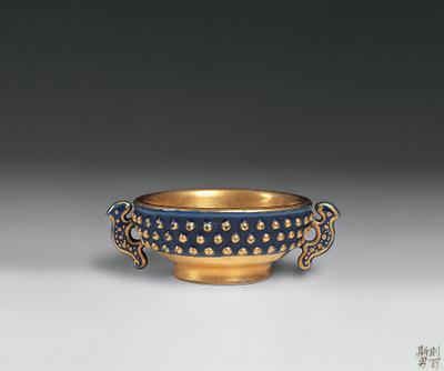 乾隆时期是清代社会发展的鼎盛时期,各类御用工艺品的制作在中国古代工艺美术史上占有重要地位,形成了最后一个繁荣阶段。景德镇御窑厂瓷器制作工艺在乾隆时期达到了陶瓷史上的最高水平,无论是数量还是质量均达到了历史的顶峰,瓷质之精细,釉面之莹润,造型之新奇,色彩之绚丽,可谓登峰造极。正如《陶雅》中评价:“倡条冶叶,不乏奇丽之观。”《饮流斋说瓷》中也说:“至乾隆,则华缛极矣,精巧之致,几乎鬼斧神工”。当时凡是日常生活中所用器物,均可用瓷器来仿效或取而代之,清人朱琰在《陶说》中曾作过全面概括,他在谈到文房用具时说,瓷器除有“砚屏、墨床、书滴、秘搁、镇纸、司直各适其用”之外,放笔有笔管、涮笔有笔洗,安笔有笔床,架笔用笔格,插笔有笔筒,也一应俱全。至于“饭勺、茶匙、筷箸、蜡斗、醋滴、澡盘、灯盏、方枕、圆枕、盆、缸、瓮、钵、盘”等生活用具及斗茶、曹饮、馈食之所需壶、尊、碗、碟为类更繁,难以枚举。“戗金、镂银、琢石、髹漆、螺钿、竹木、匏蠡诸作,无不以陶为之,仿效而肖,近代一技之工,如陆子刚治玉、吕爱山治金、朱碧山治银、鲍天成治犀、赵良壁治锡、王小溪玛瑙、蒋抱云治铜、濮仲谦雕竹、姜千里螺钿、杨埙倭漆、今皆聚于陶之一工”。乾隆时期景德镇制瓷业取得的巨大成就,与当时的督陶官唐英有着密切的关系。唐英,字俊公,号蜗寄,沈阳汉军正白旗人,生于康熙二十一年(1682年)五月初五,卒于乾隆二十一年七月二十九日。雍正六年,唐英被派驻景德镇督陶协理,乾隆四年升为督陶官,直至乾隆二十一年,督理景德镇御窑厂达27年之久,对雍正、乾隆时期制瓷工艺的发展起到了重要作用,因此人们将雍、乾隆时期景德镇官窑称为“唐窑”。雍正六年,他初到景德镇时,对陶瓷生产一无所知,于是与窑工共同生活了三年,刻苦钻研陶务,最后对“泥土,釉料,胚胎,火候,具有心得”并“躬自指挥”,加之他本人博才多艺,精通书法、绘画.在文学上也有很深的造诣,使制瓷技艺有了极大的提高。他在乾隆八年,总结了景德镇千百年来积累的制瓷经验,撰写的《陶冶图说》、《陶人心语》等著作,图文并茂,对研究景德镇制瓷工艺的发展具有重要的价值。从北京故宫博物院收藏的乾隆时期陶瓷传世品的品种及数量上看,他所督造的御用瓷器中,最突出的成就是仿古及创新之作,其中以仿制历代名窑制品为大项,占有重要的地位。此外还有大量的仿制各类工艺品的奇巧之作,精美绝伦,仿品中有的精美之作与真品实物对比,其形态、色泽相同,质地真切,难分真假。藏品中大致有以下几类,仿木器、仿竹器、仿漆器、仿金属器、仿玉石器、仿织锦纹及摹仿各种动、植物的象生瓷等,大多摹仿器既模仿实物的造型、釉色、纹饰,但非亦步亦趋,而是赋予了鲜明的时代内涵。 仿古铜器:仿古铜器是清乾隆时期景德镇御窑厂仿制各类工艺品中,最为成功的瓷器品种。一般多以茶叶末或酱釉来摹仿青铜器釉色,用松石绿釉及金、银彩来仿效铜器上的锈斑、错金银、洒金、鎏金、旧色等,无不惟妙惟肖。仿青铜器造型有双牺樽,各式壶、觚、洗、鼎、炉、盒等,底部一般多有大清乾隆年制篆书刻款。如仿古铜彩牺耳尊(彩版一,1),高21.8厘米,口径13.2厘米,足径11.7厘米。尊撇口,鼓腹,圈足外侈,肩两侧各堆饰一牺耳,平底,底中心金彩双栏内阳文篆书六字三行“大清乾隆年制”款。通体仿战国错金银铜器,茶叶末色地上分别用金、银彩绘制图案,以战国铜器上流行的纹样为题材。颈部、足上部各有蟠螭纹一周。腹上部为菱形云雷纹,下层是变形蝉纹。铜器的色泽、锈斑及嵌金银工艺,模仿得几可乱真。此件牺耳尊曾见于唐英的《陶成图》画卷,是清代制瓷技术取得高度成就的具体反映。 乾隆古铜彩双螭耳海棠式瓶(彩版一,2),高5.5厘米,口径4×4.3厘米,足径5×5.7厘米。瓶呈海棠式,颈两侧对称饰螭耳。通体施酱釉描金,口沿模印蝙蝠纹,腹部四面有正方形开光,开光内模印夔龙捧“寿”图,肩部及近足处均模印如意云头纹,足墙凸印朵花纹,底施酱釉,无款。此器造型新颖,所饰纹样为明、清时期流行的吉祥图案,图案下饰松石绿釉,突出表现了青铜器所特有的沉着色调及青铜锈斑效果,工艺精湛。 仿古铜彩描金兽耳活环盖罐(彩版一,5),高32厘米,口径7.5×8.2厘米,足径9×11.4厘米。罐椭圆形口,短颈,扁圆腹,腹下渐敛,圈足。肩部对称塑兽耳。通体施茶叶末釉描金装饰,口沿绘下垂的如意云纹,腹部凸起两道弦纹,内饰夔龙纹一周,弦纹上下均绘蝉纹。近足处绘上仰的变形如意云纹,与口沿纹饰相呼应。拱形盖,宝珠纽。盖面从边沿向上共饰有四层纹饰,依次为回纹、蝉纹、如意云纹、莲瓣纹。底刻“大清乾隆年制”六字三行篆书款。此器造型隽秀,器型仿古又有创新,釉色及纹饰均仿青铜器,工艺精细,具有明显的时代特征。 仿古铜器中还有大量仿黄铜制品,釉面光亮如新,以金彩描绘纹饰,摹仿铜鎏金效果,尤显富丽堂皇。如仿古铜彩描金双立耳盖鼎(彩版一,6),高28厘米,口径20.5厘米,足距18厘米。鼎为直口唇边,口沿处对称饰双立耳,短颈,圆腹,下承三足,足内侧有一出气孔。拱形盖,上有镂雕灵芝形钮。通体施酱釉,外壁描金,口沿一侧刻“大清乾隆年制”六字篆书横款,余地绘回纹。颈部绘水波纹,腹部两面凸饰如意形开光,开光内饰双螭纹,开光间凸饰相对