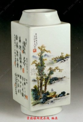 汪野亭瓷板山水画题诗:谁将笔墨写秋山,点缀烟霞尺幅间。欲访高人在何许,寒林渺渺水潺潺。此诗与瓷画互为衬托,后两句乃点睛之笔,意味无穷,让人联想。汪“亭的另一幅山水瓷画题款为:秋色苍茫草木凋,霜薪采得半肩挑。深深落“迷行径,山月随人过“桥。诗的意境之美无可比之。王琦《钓叟图》瓷瓶画面题诗妙趣横生:狂饮一壶酒,钓竿呼为友。此趣问谁知?惟有鱼叟翁。又有熊中荣藏王琦瓷板画,一少年推一老者至山腰,老者为面前秋色所醉,少年弯腰系鞋带,王琦直接题唐人诗句.停车坐爱枫林晚,霜“红于二月花.点题。秀才出生的邓碧珊在《生趣都从笔底开》瓷板题诗:弄萍濯破镜花秋,掉尾扬鳍得自由。最怕碧峰岩下影,风藤如线月如钩。题诗趣味横生。雪景大王余文襄先生一生专攻雪景瓷画,取得了前无古人的成就。他在300 件瓷瓶上作《瑞雪迎春》图,被江西画报选为封面。其上配诗:新年都未有芳华,二月春风见草茅。白雪却嫌春色晚,故穿庭树作飞花。诗配画贴切之极。黄秀乾先生创造《大吉图》诗为:福禄原由道德修,寿贵清心自解愁。少壮耕耘勤奋力,喜躁门楣报志酬。诗对人生的感悟何其丰富而恰切。无怪乎其作品受藏家的喜爱。
