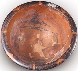 仰韶文化时期的彩陶图案,是在陶器未烧之前画上去的,烧后彩纹固定在陶器的表面不易脱落,彩绘以黑色为主,兼用红色。有的地区在彩绘之前先涂上一层白色的陶衣作衬底,以使彩绘花纹更加鲜明。彩陶的主要纹饰有花卉图案、几何图案和动物图案。这些图案多装饰在细泥陶钵、碗、盆和罐的口、腹部,而在器物的下部或往里收缩的部分是不施彩的,这种设计与当时人们的生活习惯有一定的联系。因为新石器时代家居条件还相当原始,通常席地而坐或者蹲着,所以彩陶纹饰的部位大都在人们平视最容易看到的地方,再往下因为看不到,也就没有装饰了。