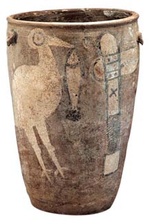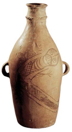 在黄河中下游地区的陶器装饰中以鸟为主要题材,而在这一地区的文献中也有一些以鸟为氏族图腾的传说和记载。在仰韶文化晚期彩陶图案中,有一种被拉长身体的双头多足鸟,这种鸟纹常常和太阳纹一起出现,表明这种以鸟为图腾的氏族,也许是崇拜太阳的。当时的人们将图腾装饰在彩陶上,最大的用意是什么呢?可以设想,随着各个氏族、部落之间的交往越来越频繁,成员常常会彼此融合混杂,难以分辨。图腾标志和图腾名称的存在,使人们可以准确无误地识别群体。陶器作为当时人们的日常用品,其装饰也难免会打上本氏族的某种标记,以便和其他氏族的陶器区分开,这种标记可能就是图腾的标记。