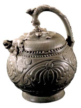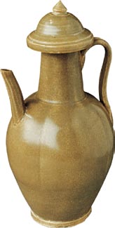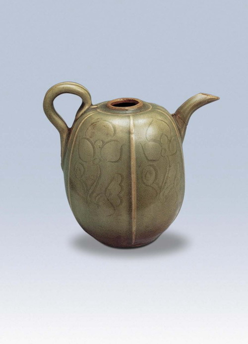 宋代耀州窑青釉剔花倒装壶,高19厘米。陕西省博物馆藏。