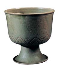 越窑青釉刻划花纹杯, 高13.2厘米。