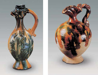 (左)三彩凤首陶瓶 (右)三彩叶口壶 唐代胡瓶,