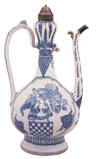 针对欧洲市场,景德镇的陶工们制作了一批图案性、装饰性极强的青花瓷。这类器物种类很多,有碗、壶、瓶、盘等,其中以盘类居多。其装饰手法是将器皿不同部位分成等分相同或不同的几何形“窗口”,然后再在里面配以水果、花卉等华丽的图案,而每格大“窗口”边上又以小“窗口”隔开,在这小的“窗口”往往饰以八宝纹、璎珞纹等,这些几何形的窗状纹样好似芙蓉花瓣,故被日本人称为“芙蓉手”,而欧洲人则称之为“克拉克”瓷。在盘子中间的主要画面里一般以当时北欧流行的静物画和风景画为装饰。另有一种在壶颈上装饰着郁金香、壶体上描绘着芙蓉手式的轮花纹酒壶,式样非常优美,造型和欧洲的银器很接近。这些瓷器制品制作非常精细,胎体薄而讲究,欧洲人非常喜欢,以至不惜重金购买其中的精品。欧洲人买到这种瓷器后非常珍视,常常为其加上金属配件,有些碗做得较薄,为了防止端起来烫手,就给碗套上一种连着碗口和碗底的金属的环,两边还安有非常讲究的提手。对于上面提到的那种酒壶则在壶嘴上加一个银制的套子,通过一根银链将套子连接在壶颈的银环上。这些金属的陶瓷附件,不仅更方便使用,还增添了器物的美感和华丽的气氛。