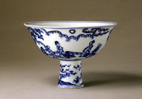 17世紀景德鎮瓷器主要體現在兩個方面,其一是供應國內市場的傳統器物,與少量官容的繼續燒制。其二是根據國外市場的要求而定做的一批外銷瓷。這批外銷瓷主要銷往歐洲及日本、東南亞等國,這些瓷器的圖案與器形都具有他國的特點。同時,也有一些裝飾有國內傳統圖案的瓷器銷往國外。其中,青花人物故事紋在國外的大量出現,可以證實當時也有一部分繪有國內傳統圖案的瓷器遠銷海外。這些人物故事紋大多直接從當時版畫中移植到瓷器上。版畫本是明代文人寓文化、藝術于一體的精心構思,將這些圖案用青花繪于瓷器上同時也反映了17世紀窖業主的文人氣息。版畫中的人物插圖移植在瓷器上在元代就已出現,但為什么直至明末清初才取得如此巨大的藝術成就?我想除了此時的版畫業本身取得了巨大成就而外,陶瓷工藝本身的提高也是顯著的。成書于明嘉靖之間的《江西大志?陶書》記述了回青料的處理分“敲青”和“淘青”兩個工序,這是“水洗法”。成書于崇禎時間的宋應星《天工開物》中則記錄了處理青料用火鍛法,文中載道:“凡畫碗青料,總一味無名异……此物又生深土,浮生地面,深者掘下三尺即止,各省皆有之。……同時先將炭火叢紅鍛過,上者出火成翠毛色,中者微青,下者近土褐,上者每斤鍛出只得七兩,中下者以此縮减。”從水選到火鍛是陶瓷工藝中的一次重大改革,轉變期瓷器中出現大量發色明艷的青花瓷,正是源于此。轉變期分水技法的高度成熟也是這時期青花瓷取得巨大成就的主要因素。由于青花料提煉技法的改進,使得青花發色更加明艷,分水技法日臻完善。出現了名噪一時的“青花五彩”,畫面層次更為豐富,達到“墨分五色”的效果。將之與其時版畫人物故事紋相結合,使元代同類型的青花人物故事紋相形見拙。