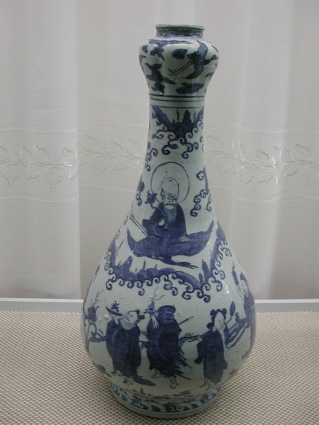 这是两件颜色釉的瓷器。这个是仿汝窑的海棠瓶,景德镇仿各种窑系制作的瓷器都非常好,有“仿汝超汝、仿官超官”的说法,这件海棠瓶就超过了汝窑,因为汝窑烧不出这么大件的瓷器。而这一件就是“祭红”瓷,是用来作祭祀用的。你看它的釉色非常均稳安定,不像郎窑红那样有大量的垂流现象。烧制这种釉色必须要保持好窑炉中的温度。但是由于当时烧窑的燃料是松木柴,窑火温度很难达到衡定,所以这种釉色很难烧成功,有“千窑一器”的说法,意思是烧1000次才可能出这么一件好瓷器。说到祭红瓷,它还有一个传说,说明代宫廷命景德镇烧制一种红色瓷器,但很久都没有烧造成功,而期限马上要到了,再烧不出来可是要杀头的。就在烧最后一窑的头一天晚上,一位老瓷工的女儿做了一个梦,梦见瓷器的配方中少了一种成分,那就是人血。于是在最后一天晚上,这个小姑娘纵身跳进烈火熊熊的瓷窑中,用自己的鲜血染红了窑中的瓷器。这个传说还被拍成了电影,片名就是《祭红》。