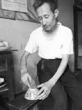 从事剐坯几十年,剐坯到什么程度才是好?曹开永说,“灯芯草坝子、起线釉、凳板底子”,就是碗底要跟灯芯草一样匀称,线一样细,凳板一样平,坯烧成瓷器后底部能微微透光,这才算是见了真功夫。他剐的坯一次成功,碗底可透光,他说“利坯能明如镜,我这也是明如镜嘛”。他拿出一只大碗,比划着说:“因为剐了坯,碗的底子厚,盛开水不烫手,没有经过剐坯的碗底子薄,盛开水烫手。”曹开永的小儿子是个80后,和曹开永一样,他没有继承父亲的手艺,16岁就学了利坯。