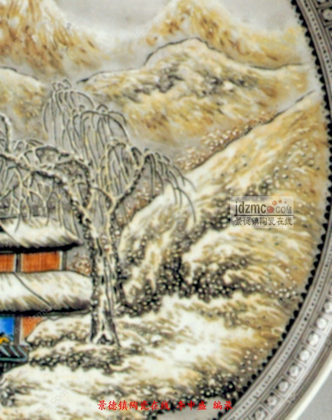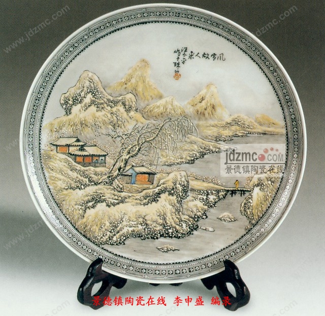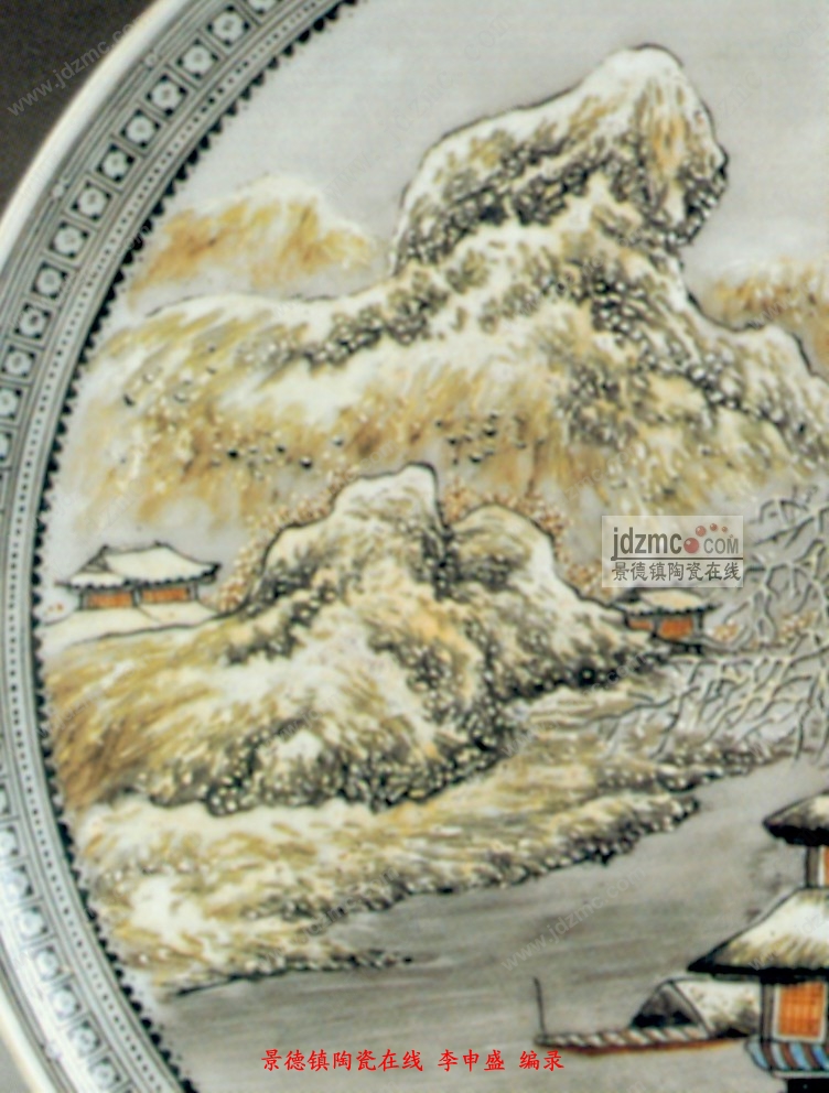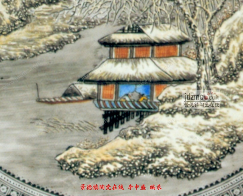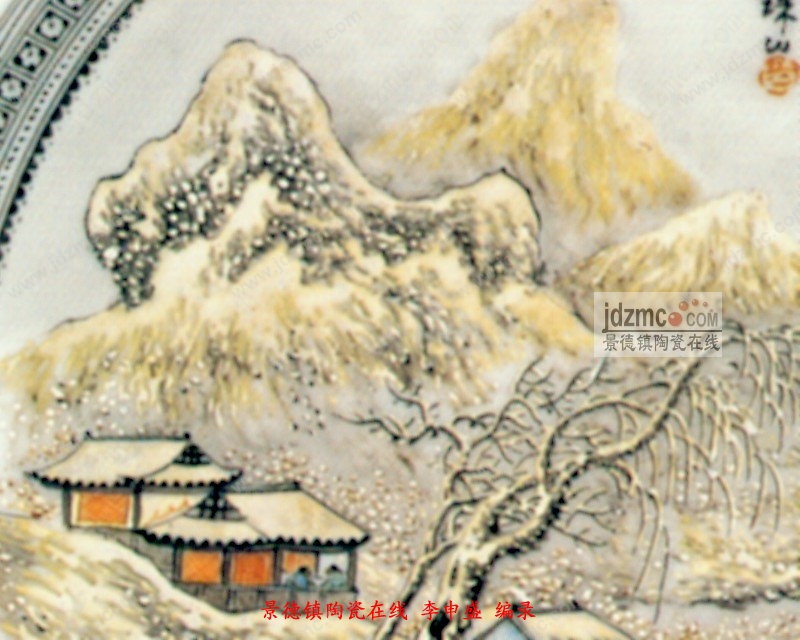 这是两块雪景山水挂盘。挂盘与座盘不同,较平。后有洞供穿绳吊挂之用。这两块雪景从画风及运笔来看, 比较工细,应是汪少平先生早期作品。亦属写意之随笔。描绘的是山溪景色。有山有水,树木、房屋、人物各具其态。彩绘方面特点主要是层次较复杂, 尤其是右图“夜半书声”。因层次一多便增添了着色的难度。故一般画雪景者,用这种章法的较少。但本图却处理得很好,远近层次分明,景物错落有致。