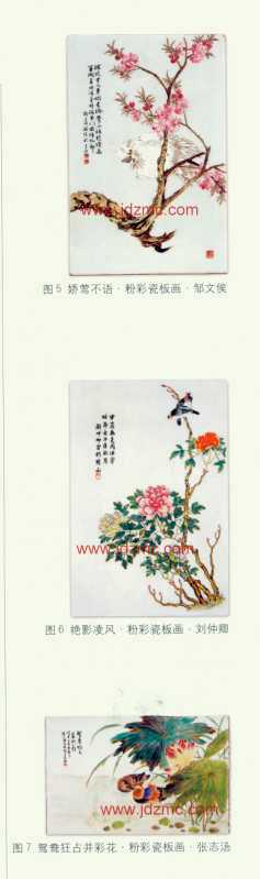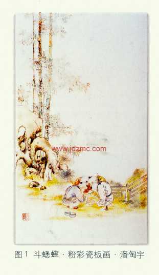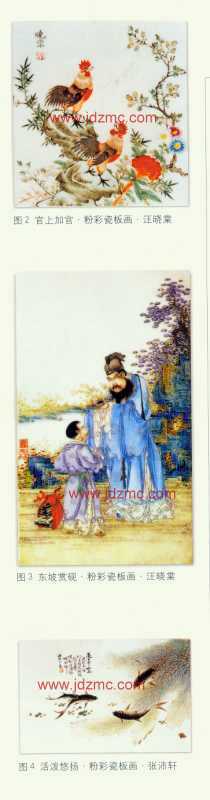 19世纪末20世纪初,中国社会处在改良变革之中,为振兴民族工业,各地制瓷行业相继成立了一些瓷业公司、瓷业学校、陶瓷画社等。在改良发展的竞争环境之下,彩瓷行业出现了一些新的变化,粉彩艺术得到了中兴,而浅绛彩艺术己逐渐被其取代,这其中主要原因是浅绛彩色域单调,且易脱落,而粉彩色域丰富,又有深厚的传统工艺基础,在吸收了浅绛彩文入画形式之后,更为人所喜爱。20世纪前期,景德镇彩瓷行业除 “红店”的“匠派”艺术之外,还有一批开拓创新的瓷画家,他们承继了浅绛彩画家所开创之先河,有的组成画社,有的独自开立画室接写瓷器,也有的受职红店。这一时期较为著名的瓷艺家有潘甸宇、汪晓棠、汪东荣、周小松、许尚礼等。 现代粉彩艺术,早期以名家潘甸宇、汪晓棠的作品为代表。他们以职业彩绘教师与画家的身份出现在艺坛,着重画理与技巧的结合。他们瓷画上的用笔,勾勒、拓抹、点虱等都适应干生料、油液与胎釉面的性质。瓷绘材质不同干纸绢上的墨色,对作者自由扦发性情,大胆挥洒笔墨有很大的限制,为了便于扦发个人的笔墨灵性,充分表现粉彩彩绘工艺的特征,他们采用以兼工带写的画风与细腻的粉彩彩绘工艺相结合的方法。作品造型准确,用笔灵活而工谨,设色雅致,表现出深厚的绘画功底和娴熟的笔墨(料)技巧。潘甸宇,汪晓棠善于学习传统,借鉴国画名家翰墨,从中吸取营养。根据画面需要,或长篇题跋,或不着一字,他们的作品,无论是构图、笔墨(料)、设色,还是题款、印章都表现出深思熟虑的构思,认真严谨的作风。 潘甸宇,字鼎钧,号淡湖外史,江西波阳人,江西省立甲种工业窑业学校图画教师。其《斗蟋蟀·粉彩瓷板画》(图1)绘庭院之青竹秀石,野卉篱栏及四个顽童相聚斗蟋蟀的场面。构图高低错落,奇中求正,左边画玲珑剔透的太湖石,造型秀美,设色雅淡,石后青竹挺立,竹叶以粉青填染,劲节秀逸,院中草长莺飞,中心位置绘孩童围着蟋蟀罐玩耍,人物神情专注,勾描细腻。画面无题款,只钤斋名“古欢”二字印。该瓷板釉色细腻莹润,制作工整,颇为精良。潘甸宇画瓷细腻精湛,以秀丽明朗见长,此画勾淡染,以粉青、粉绿、粉白填色,晶莹润厚,笔精墨妙让人回味无穷,把玩不忍释手。 潘氏擅画人物、花鸟,吸取中国画体格法度。构图空灵,以少胜多。人物画形象生动,细致地刻画人物性格与表达情感,衣褶以游丝铁线勾绘,圆转流利。花鸟画勾线填色,妍丽精细,风格清朗简淡。其亦工书,取法欧阳询。 汪晓棠,名棣,号龙山樵子,江西婺源人。早年在杭州以画扇为生,后来景德镇绘瓷,技艺超群,擅长人物、花鸟,尤擅仕女。其《官上加官·粉彩瓷板画》(图2)构图凝练,石榴树与竹枝对称开合。画面中间绘秀石雄鸡,秀石磊叠错落,雄鸡顾盼有情,昂头挺胸,旁边有红艳的鸡冠花和扁菊相配衬。画面寓意深长,有“冠(官)上加冠(官)”、“步步高升”之意。此种绘画不在形似在神似,画家在干表现其寓意,使人喜闻乐见。此图虽笔墨不多,但精神饱满。此种形式的画为当时士大夫阶层欣赏收藏。 另一幅《东坡赏砚·粉彩瓷板画》(图3)以东坡赏砚为绘画题材。画中东坡与书童立于院内,书童脚边尚有红巾裹着的数方砚台,东坡美髯长须,着学士服,正双手棒着书童递上的一方日月砚凝视端详,从小心翼翼而又神情专注的神态上可以看出苏东坡对此砚是爱不释手。人物刻画注重神韵,笔墨细腻,衣衫勾线如铁线游丝,流畅圆润,庭院山石以方块造型,非常别致,敷色瑰丽清雅,树叶着色紫红相衬,不拘泥自然,独创一格,整个画面给人一种高古清雅的艺术感受。 汪氏擅长人物,吸取西画明暗层次画法,用浓淡色描绘人物脸部,立体感强,体态多姿,造型准确,衣褶线描细劲飘逸。也画花鸟,设色丰富鲜丽,被推选任“瓷业美术研究社”副社长。 20世纪前期的瓷画家中潘甸宇、汪晓棠具有开山之祖的地位,在他们的开拓下景德镇粉彩瓷画承继了浅绛彩以来文人画风格和笔墨技巧。与他们同期的瓷板画名家除珠山八友另篇叙述外,主要人物的艺术风格简述如下: 张沛轩,江西余干人。20世纪初从邓碧珊学艺,为邓氏入室弟子,得其真传,张氏画鱼藻承继了邓碧珊之法,风格细腻灵动。活跃干1920年至1949年,后返回老家余干,作品甚少。 其《活泼悠扬·粉彩瓷板画》(图4)构图奇特,绘水藻青鱼,萍藻从右上角斜出,呈飘散荡漾之势,两尾青鱼顺势而来,与左边对游而至的青鱼相呼应,鱼姿翻仰各异,动态有别,极富动感,表现出“往来浑似弄轻梭,波纹皱处萍随动”的诗意。作者以墨彩画鱼,浓淡轻重随鱼姿变化而深浅变化,层次渲染丰富,鱼鳞以尖笔剐出,与其师邓碧珊描画鱼鳞有别,有异曲同工之妙。萍藻以墨彩勾勒之后,染浅淡绿彩,设色雅丽。画面题诗:“逐日条条不面过,往来浑似弄轻梭。波纹皱处萍随动,活泼悠扬妙趣多。”并由题而妙,别具怀抱,余音悠悠,颇有品位。 邹文侯,江西南昌人,20世纪:0年代受聘南昌丽泽轩瓷店彩瓷,1939年景德镇绘瓷,1951年卒。擅花卉、翎毛、走兽、草虫,风格清丽活泼,甜而清绝,诗书俱佳。 其《娇莺不语·粉彩瓷板画》(图5)绘桃树横出,枝干以墨彩勾勒,龙鳞老斑,点苔利落,运笔苍古,染色淡和。以中国画小写意笔法画花叶,花办以洋红点染,粉润娇美,秀逸清新,娇莺的描绘以双勾法和没骨法并用,敷填粉白,羽毛茸光洁盈,极富质感。邹文侯画花鸟不为陈法所囿,神
