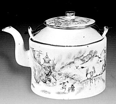 江西省博物馆收藏有程门及其次子程小松的两件浅绛方瓶, 两瓶大小和形制不一: 程门彩绘的方瓶为当时景德镇较为流行的琮式, 高30CM、 口径9. 9CM、底径11. 5Chd,微侈口, 短颈, 长方腹两面贴塑衔环象耳, 矮圈足, 卵白底釉面折光呈粥皮皱。与其它琮式瓶稍有不同的是, 其瓶四面皆画, 集山水(一面)、人物(一面)、花鸟(贴塑象耳的两面)于一瓶; 程小松的彩绘瓶为盛茶叶用的扁瓶,形制较小, 高1 6CM, 宽10CM, 侧宽5Chd。仅正背面有画, 两侧无任何图饰。两瓶虽形制不一、图饰有繁简之别,但皆是书、画、印结合为一体, 文人气韵浓郁, 士大夫风骨毕露, 堪为程氏风格浅绛瓷的代表, 且釉面细滑洁白, 确为晚清浅绛瓷中的珍品。 程门的浅绛象耳琮式方瓶, 绘于光绪四年(公元1 8 78年)。山水画面有程门署款, 各面有字、号款和钤记, 两面白篆,两面朱篆。程门姓名、字号全在同一器物上的题记及篆章中出现, 实为罕见,至为珍贵。 山水画面是“秋峰危翠泊渔船”图。近景为一危峰之麓, 绿柳湖边, 一渔舟泊于绿荫之下, 桅樯落帆, 渔翁独憩。在这天高水阔、人迹罕见之境,孤舟之上的渔翁显然不是平凡的渔猎者, 而是迷世藏身的高人; 中景大片留白, 惜“力”如金, 然而湖波山岚望之如真: 远景绵亘山川, 只绘出茅峰一二, 绵延意境已出。画中前峰虽是峻峭, 以应题记中的“危翠”之“危”,但在前柳后峦的映衬之下,仍然只是江南奇峰的风采, 没有北国高山大岭的雄伟。整个画面体现出典型的中国南派山水画传统风格。无论是笔意, 还是构图意境,整个画面活脱脱就是一幅白宣上的浅绛山水画。 山水画面的背面是一幅牧童骑牛图, 只绘半截树干、一牧童、一青牛, 竖题“小雨凉生犊背春”点题,近三分之二的画面留白。然而, 那高入云天的树冠, 青牛的来处, 青牛的去处,牧童远眺的视野, 雨丝飘舞的天空, 显而易见都是十分阔大的。整个画面用典型的浅绛笔法写画、施彩, 构图简单,但青牛的硕壮、温顺,牧童的逸致闲情,树枝的生气勃勃,青青之原上草,地上之土松泥湿, 都可观之、触之。国画中的浅绛主要是山水, 此幅瓷画虽是放大一隅, 形成以人物为中心的效果, 然而皴擦、渲染之法, 以及水墨浅绛的效果,仍是黄公望所创浅绛山水画的独特风格。 贴塑衔环象耳的瓶体两侧一面是“鼎甲图”,对面是鸟立枯枝图。 “鼎甲图”为民间工艺品常用吉祥祝福图案, 常用鸭子和芦苇构图。 因鸭字偏旁有甲字, 又与甲字谐音, 暗寓科举考试中的名次等级之“甲”; 芦苇是一棵连一棵地生K, 寓意科考中“连科(连棵谐音)”高中。如果图中是芦苇丛中一只鸭子, 则是寓意一甲第一名, 即祝人高中状元: 如该瓷瓶上芦苇中绘三只鸭子, 则称“鼎甲图”, 因为“鼎甲”是科举考试中最高等级一一殿试中录取的前三名的称谓, 即状元、榜眼、探花的统称。此种图案寓祝人高中巍科之意。 “鼎甲图”背面的鸟立枯枝图由一枯枝立孤鸟、稀疏两竿绿竹构图。横斜枯杆颇有几分梅枝意味。中国民间有梅、竹配双鹊的传统吉祥图案,俗称“梅鹊双喜”, 象征夫妻爱情深厚、和满。而此图枯梅无花n—I‘, 孤鸟无精神, 不知意蕴所在。题字为“笠道人拟口解馆笔”数字, 所指也颇为费解。 ÷ ’题记此瓶绘于“戊寅仲冬” (即光绪四年), 为“溶之先生大人雅鉴”,不知其人为谁, 已无从考证。 程楷的浅绛瓶没有时间署款, 从其釉面的洁白度高于一般晚清浅绛瓷判断,制作时间应该较晚。瓶的一面画一老者仰望云天像, 背景为两杆粗壮乔木,抵拊红岩而生, 树木茁壮。 图画构图疏旷, 寓意深沉,老者高洁的品格、超凡脱俗的期待及整幅画面高远的意境表现得十分到位。岩石、树干的设色与老者衣服极其协和,地上草绿与树叶之色也渲染得恰到好处。此画表现了程楷对乃父的技艺方法及艺术思路的传承脉络。画面题记为“虹桥老伯大人雅属 小松侄程楷书”,画白篆一个松字。 “老者望云”图画背面是“风正一飘悬”图, 画面更为疏朗,仅在左下角处画了一蓬树冠, 幅面只有六分之一,其它六分之五的留白中, 只在中偏低的位置画了一叶满帆孤舟。题记为“风正一飘悬小松”, 尾画红篆“小松”二字, 红线方框为款。整幅图画,无天、无地、无水的表意符号,然而, 人们却实实在在地感受到了土地的坚实,水波的浩渺, 天空的阔大, 大气流行的伟力, 以及天籁的悲壮。风飘飘的意境与风的飘扬方向是通过柳树飘舞的枝条表现出来的。据图画题记, 人们可以猜出作者此构的意蕴所在: 在这阔大的世界里,那渺茫茫无依凭的满帆孤舟,不就如迎风飞翔的断线之鸢吗?这与正面“老者望云”的恬淡, 正是因果相连的一句宿命话语。这句简易而沉重的话语,在中国历代文人的心海中, 已经郁积、演绎了上千年。程小松,就这么简单, 在这么小的一个茶叶瓷瓶上,扼要地释放了出来。清初名画家笪重光有句名言: “空本难图, 实景清而空景现;神无可绘, 真境毕而神景生。位置相戾,有画处多属赘疣;虚实相生, 无画处皆成妙境。 ” 《画筌》程小松可谓完全悟得了个中奥秘。 浅绛彩瓷是中国传统国画艺术与民间工艺相结合的产物。彩绘方法是,用黑色釉上彩料在瓷胎上浓淡相间绘出纹饰, 然后罩上淡赭、淡紫、淡蓝、水绿及草绿等色彩, 经600’C一一700‘C的低温烧成。浅绛彩绘有选择地继承和吸收了青花、古彩、粉彩
