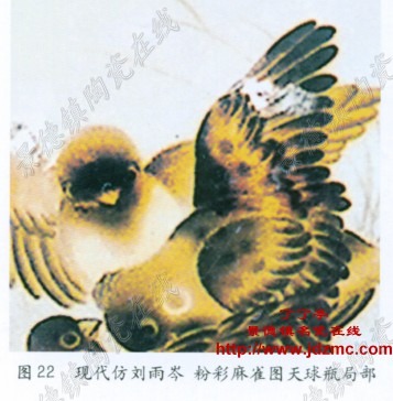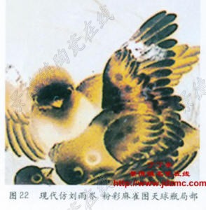 图22粉彩麻雀图天球瓶局部,画旁题有刘雨岑名款,底亦见有刘氏“饮冰斋”篆款,但从作品的画工、料彩来看非刘氏真迹,乃现代人仿作。三只麻雀虽姿态各异,但无神韵,墨色之间的过渡生硬,羽毛质感不强,花朵设色浓重而略显混浊,与刘氏设色鲜丽柔润之风差别较大。