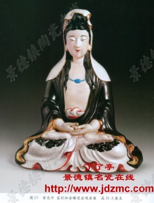 图23为窑彩加金雕瓷坐观音像,底有“曾龙升造”篆书刻款,为曾氏代表作品之一。图24雕瓷观音像底亦见此款识,但决非曾氏之作。首先从造型上看,后者明显不及前者端庄,神态亦较欠缺。其次,前者肌体丰满,如手部及足部的刻画,而后者有形无肉,以长袖遮住腕部,双足为浅浮雕手法,显然是功力不足所致。其三,真品细节到位,如指甲、脚趾的一丝不苟,而后者则一律加以省略。其四,真品衣褶较深,线条流畅自然,后者浅而生硬,而且由于艺术修养不足,将真晶中飘洒而下的衣裙改成莲花宝座,从整体造型上看极为牵强,艺术水准不高。