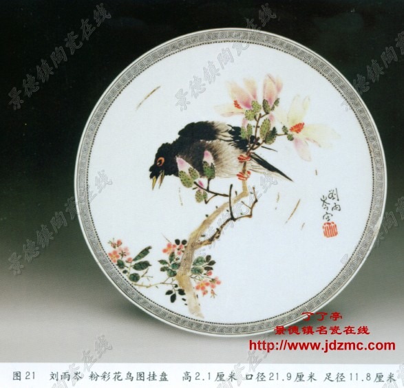 图21粉彩花鸟图挂盘,玉兰树上一只八哥在枝头啼呜,枝干、花叶以没骨法为之,花办双勾填色,发色浅淡柔和,花蒂以淡绿渲染,上点墨彩,造型饱满,八哥以墨彩精心绘画,墨色浓淡相间,鸟羽蓬松,质感强烈。右侧墨书“刘雨岑写”及红彩白文方章一枚。