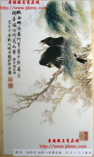 图96为刘雨岑1929年粉彩八哥图瓷板,构图上密下疏。桃红柳绿,柳树以墨勾线,上罩浓淡青绿,春风吹拂之下极为洒脱;桃花以点虱法绘画,娇艳妩媚。桃枝柳荫之中,有两只墨彩八哥,一只高声鸣唱,一回首啄羽,黄嘴红爪,颇为传神。左上墨书“桃与柳,依旧斗芬芳,千丝万片搅柔肠,怕听鸟如簧。调寄谢秋娘。己巳夏莫,刘雨城并题于饮冰斋”及红彩白文“雨”、朱文“岑”方章二枚。由此画作可知,刘氏当时还没有形成笔意潇洒,韵趣盎然的个人风格,尤其是桃花的画法更非其水点桃花可比。在此需要多说一句的是,民国时期瓷器上的花鸟图多绘八哥,不仅大名家绘,小名家绘,就连低档次的日常生活用瓷上亦见有八哥。不知是此时民间饲养八哥成风,还是八哥善学人语为艺人所喜爱,或是八哥在艺人的笔下寓意着什么。