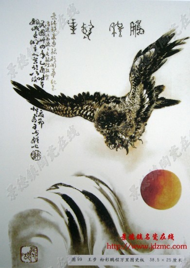 图99为王步1945年粉彩鹏程万里图瓷板,一展翅雄鹰占据了上部大面积空间,以浓淡相间的墨彩勾勒点染,极富傲视天下的气势,下方粗笔勾描渲染的海浪托起一轮红日,风格洒脱豪迈。上方以篆籀题“鹏程万里”画额,行草书“景德镇交通银行开幕纪念,浮梁江西源源长银行敬贺。民国卅四年乙酉时在夏节,剑城长湖主人写于竹溪草庐王步戏作”及红彩朱文“竹溪”圆章一枚。虽题为“戏作”,但笔墨之间极见功力。左下角押红彩朱文“长湖”方章。题款中“剑城”为王步家乡丰城之别称。典出《晋书·张华传》,雷焕“为丰城令,焕到县,掘狱屋基,人地四丈余,得一石函,光气非常,中有双剑,并刻题,一日龙泉,一日太阿。”故丰城又谓剑城。因王步题款多为行草,时人多识为“钢”或“丰”字,实乃大谬。以苍鹰为瓷器纹饰始见于明代,清代较为少见,但明清两代鹰纹均无王步之气势。